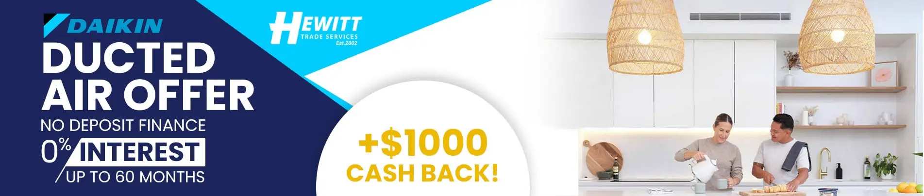 Hewitt Trade Services are now offering up to 60 months, no deposit, 0% interest free finance* on selected Daikin ducted air conditioning packages + $1000 Cashback!